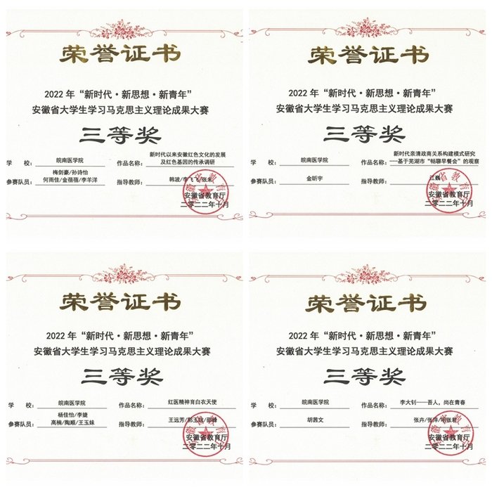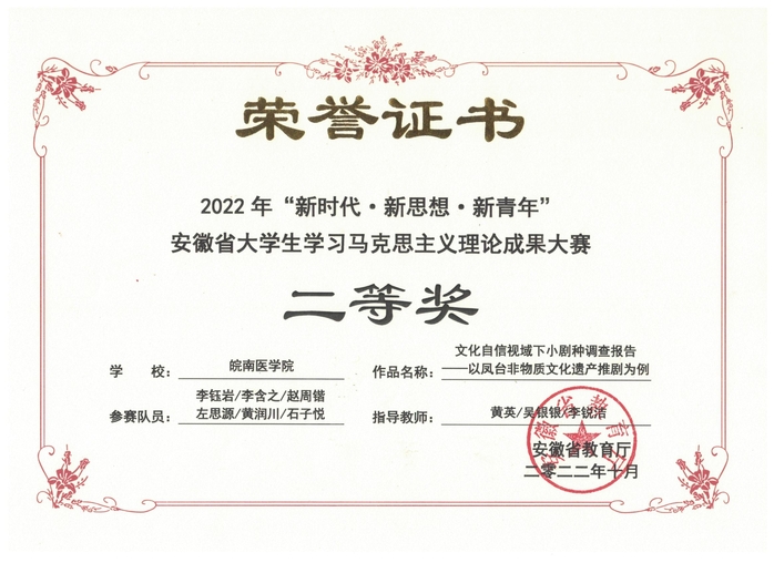 近日,安徽省教育厅公布2022年“新时代·新思想·新青年”安徽省老员工学习马克思主义理论成果大赛获奖名单,公司员工再获佳绩,共获二等1项、三等奖4项,其中在社会实践(调查)报告类别中,李钰岩等同学的《文化自信视域下小剧种调查报告——以凤台非物质文化遗产推剧为例》和梅剑豪等同学的《新时代以来安徽红色文化的发展及红色基因的传承调研》两件作品分获二等奖和三等奖;在研究论文类别中,金昕宇同学的论文《新时代亲清政商关系构建模式研究——基于芜湖市“畅聊早餐会”的观察》获三等奖;在微视频类别中,杨佳怡等同学的《红医精神育白衣天使》和胡茜文同学的《李大钊——吾人,尚在青春》两件作品获三等奖,公司获“最佳组织奖”。