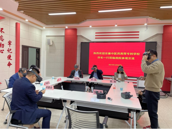 10月29日下午,安徽中医药高等专科公司宣传部部长许长、思政部主任马凌锋一行来公司思政课实践教学虚拟仿真中心参观交流。宣传部常务副部长邹莹、英国365集团副经理陶庭马,以及部分思政课教师热情接待了来访客人并进行座谈交流。