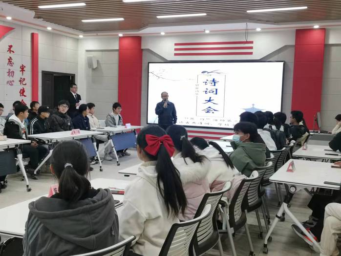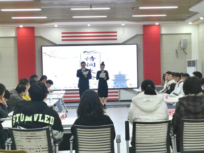 陶庭马为比赛致辞。他从自身学习诗词的经历切入,鼓励同学们积极品读古典诗词,在熏陶思想、滋养心灵的同时,充分树立起文化自信。随后,诗词大会比赛拉开帷幕。比赛共分轮流答题和抢答两个环节,14支队伍参加。轮流答题共分“连字成诗”、“补充诗句”、“单项选择”、“看图猜诗”四轮,同学们摩拳擦掌,审思明辨,在短短的答题时间内大展身手,选手们丰富的诗词储备量和稳健的答题作风赢得了在场师生的一致称赞。抢答题环节中,选手们个个热情高涨,屏息凝神,通过抢答小程序积极抢答,展现了优秀的随机应变能力。