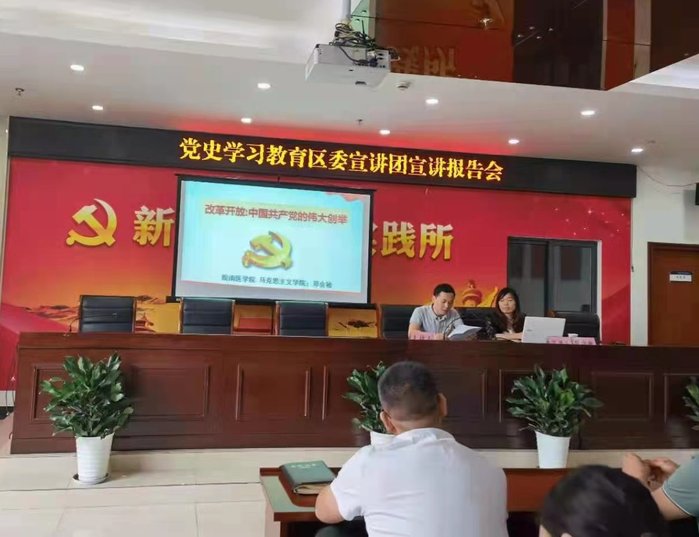 宣讲中,老师们或紧扣中国共产党改革开放和社会主义现代化建设的主题、主线,系统回顾四十年来我们党团结带领人民走过的光辉历程,取得的辉煌成就;或从新民主主义革命时期、社会主义革命和建设时期、改革开放新时期和党的十八大以来四个阶段出发,全面回顾中国共产党百年奋斗的光辉历程和历史贡献;或用一个个鼓舞人心的党史故事、一件件珍贵翔实的党史资料向与会者阐释中国共产党为什么“能”、马克思主义理论为什么“行”的哲学依据和制度保障;或紧扣坚持中国特色社会主义道路这一鲜明主题,回顾改革开放的历史背景,阐述改革开放取得的主要成绩和经验启示,引导大家深刻认识中国共产党为国家和民族作出的伟大贡献,深刻感悟中国共产党始终不渝为人民的初心宗旨,学习中国共产党推进马克思主义中国化形成的重大理论成果,传承中国共产党在长期奋斗中铸就的伟大精神,坚定不移听党话、跟党走,在全面建设社会主义现代化国家伟大实践中建功立业。