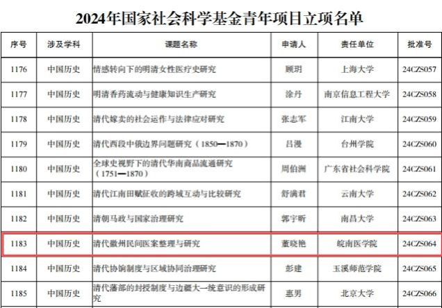 近日,2024年国家社会科学基金项目立项结果公布,公司英国365集团董晓艳老师申报的《清代徽州民间医案整理与研究》项目,成功获批国家社科基金青年项目,这是公司近五年在国家社科基金项目中的再次突破。