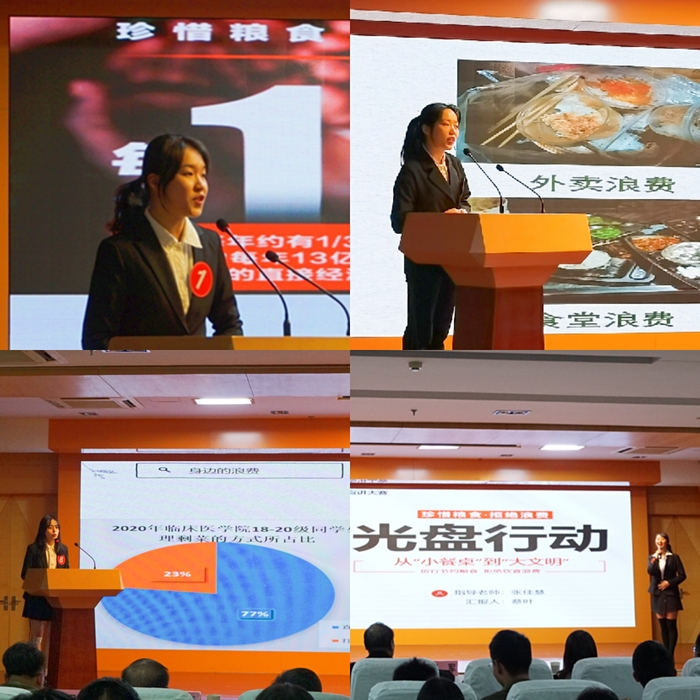 大赛采用PPT展示和现场解说的方式,参赛选手以习近平总书记关于制止餐饮浪费行为的重要指示入题,或慷慨激昂,或娓娓道来,结合主题班会、光盘打卡等身边人和身边事,向同学们宣讲“厉行节约 反对浪费”的必要性,号召老员工传承艰苦奋斗的优良传统,增强社会责任感,将尊重劳动、珍惜粮食的美德内化于心、外化于行。选手们精美的PPT和精彩的演讲赢得了阵阵掌声。经过激烈角逐,最终决出一、二、三等奖,并进行现场颁奖。