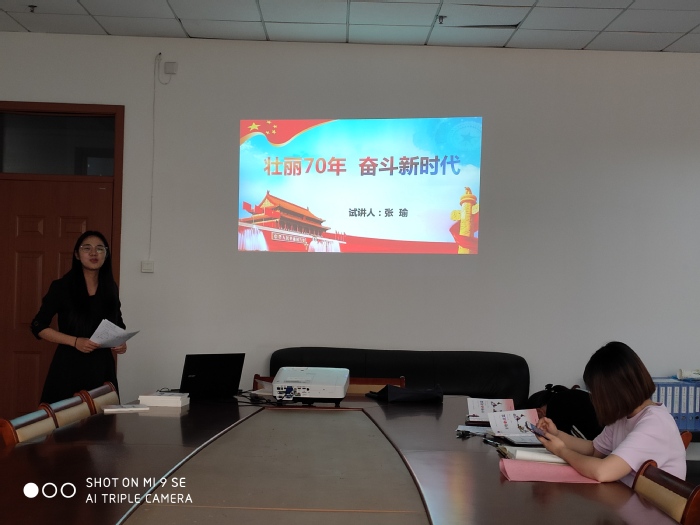 在新教师试讲环节,今年新进人员张瑜就《庆祝新中国成立70周年》专题进行了试讲,参会老师对试讲内容和形式作出点评,一致认为她备课充分、教态自然、讲解生动,并提出改进提高的意见和建议。