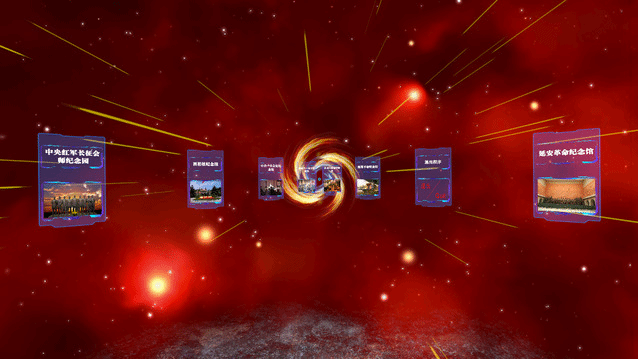 体验者戴上头盔畅游在红色时空隧道中,自由选择想要学习的大量红色全景纪念馆(园、旧址),在自由穿越时空和穿越时间的过程中进行互动体验和自由学习,实现真正意义上的空间穿越,与各红色纪念馆(园、旧址)之间进行触觉、听觉和视觉上的交互。